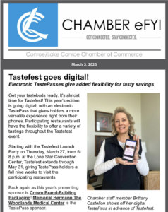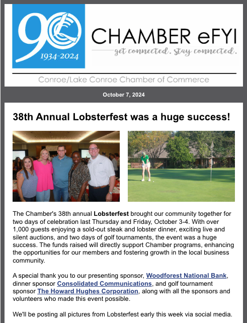 Publications March 17, 2025: Excitement builds for Tastefest March 10, 2025: TWC Chairman Bryan Daniel to address Chamber April 7 March 3, 2025: Tastefest goes digital! Join The Chamber The Conroe/Lake Conroe Chamber is here for your business. Engage now to expand your networking opportunities and to be a part of our community’s growth. CONTACT US
